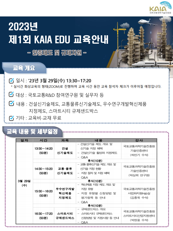 아래와 같이 2023년 제1회 KAIA EDU 교육안내를 드리오니 많은 관심 부탁드립니다.